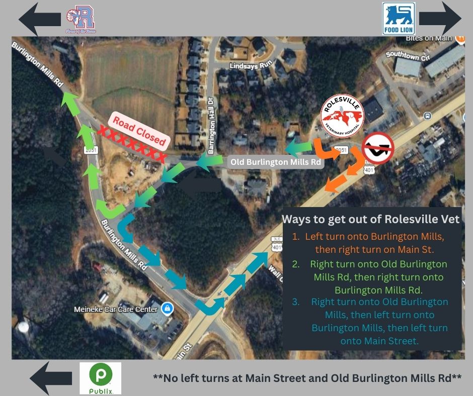 We are currently experiencing road construction aroundRolesville Veterinary Hosital. Please review the maps for the best way to enter and exit the hospital.