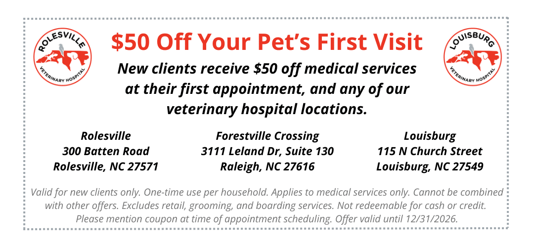 Full-service veterinary hospital family serving Rolesville, Raleigh, Louisburg, Wake Forest and surrounding areas