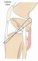 The knee joint is opened and inspected. The torn or partly torn cruciate ligament is removed. If the meniscus is torn, the damaged portion is removed. A large, strong suture is passed around the fabella behind the knee and through a hole drilled in the front of the tibia. This tightens the joint to prevent the drawer motion, effectively taking over the job of the cruciate ligament.